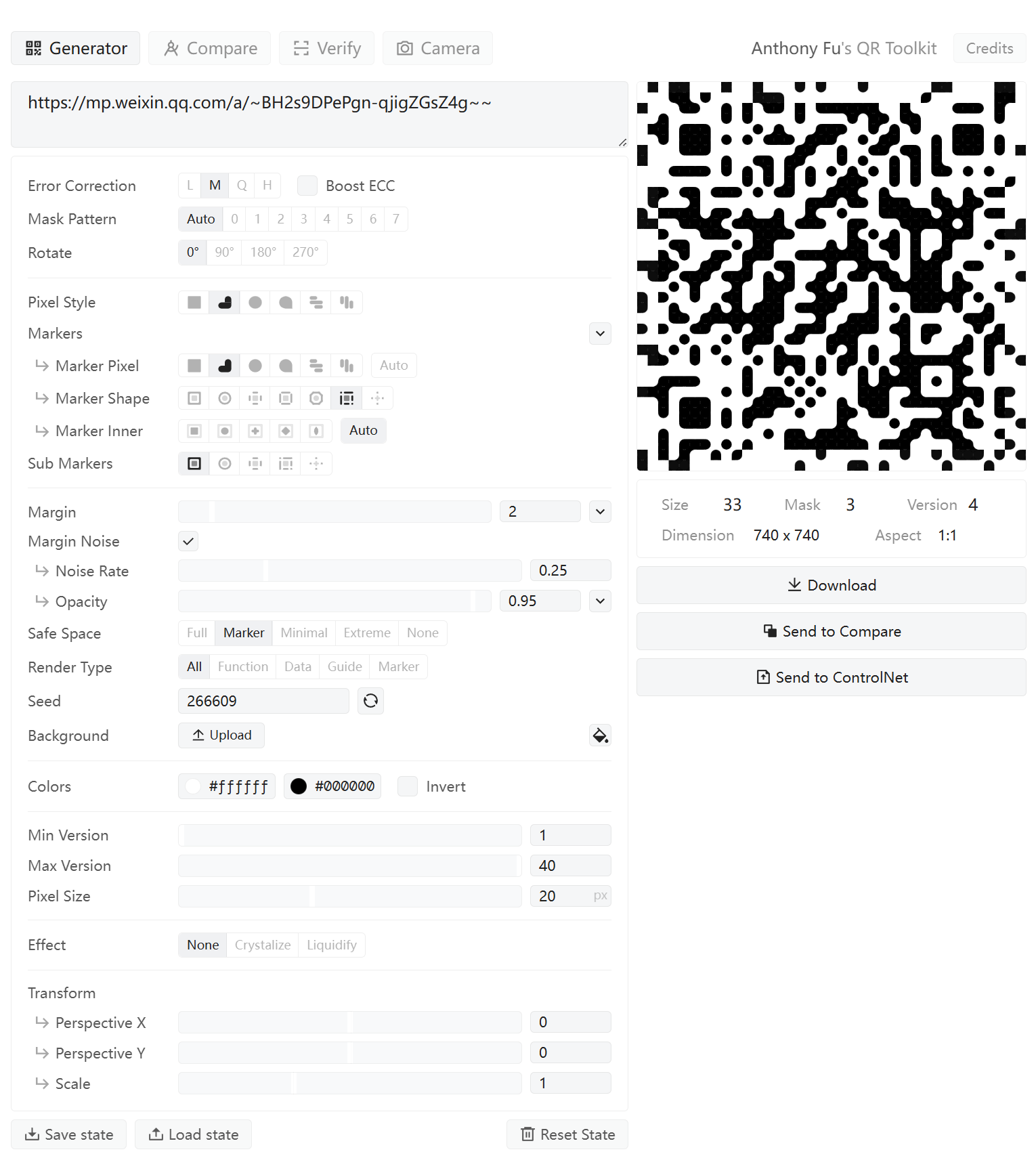 将解码后的 url 复制到 QR Toolkit 插件中,并修改其样式,样式类型不影响正常扫码,但会影响生成后的识别成功率,可按照下图提供的参数来设置。