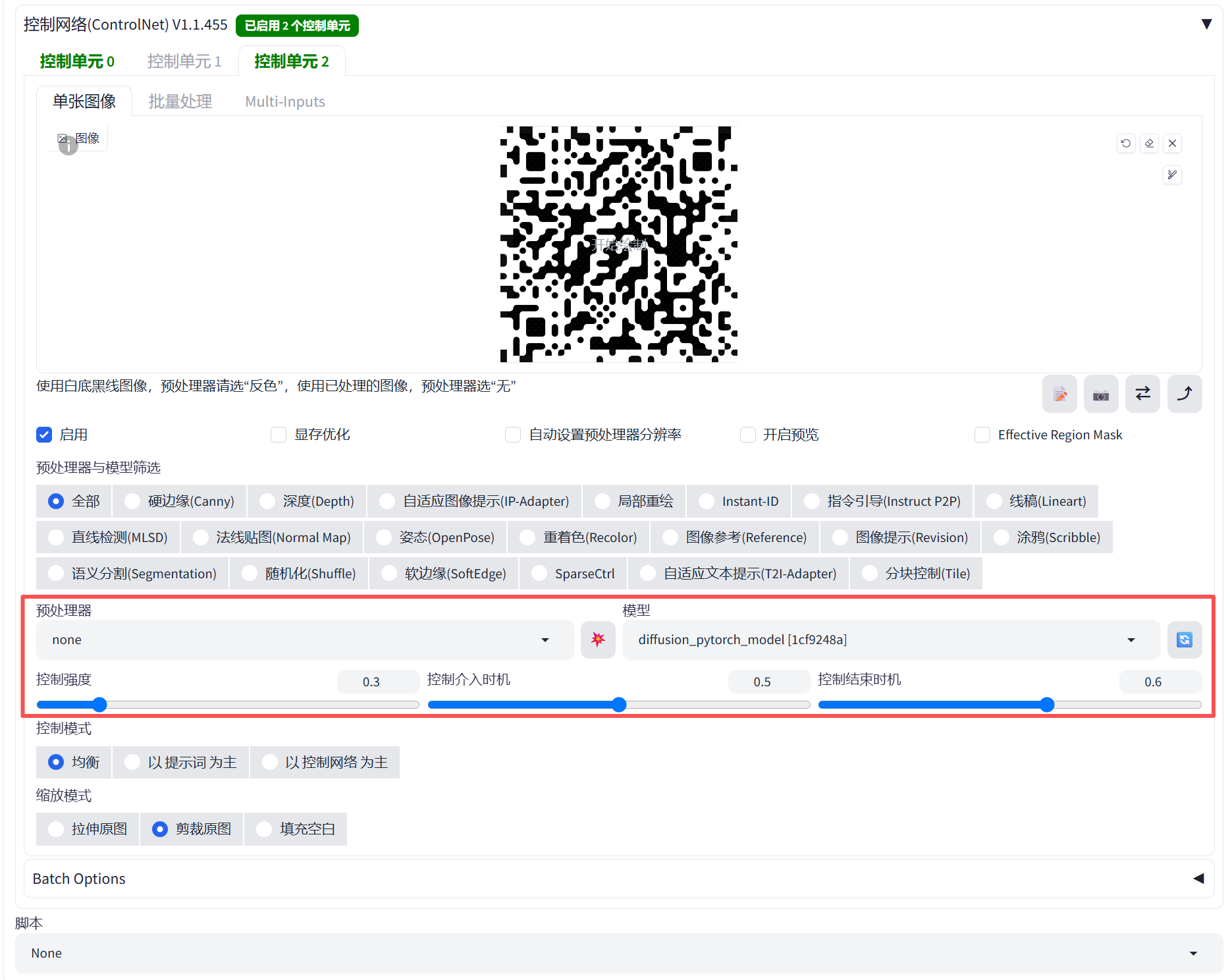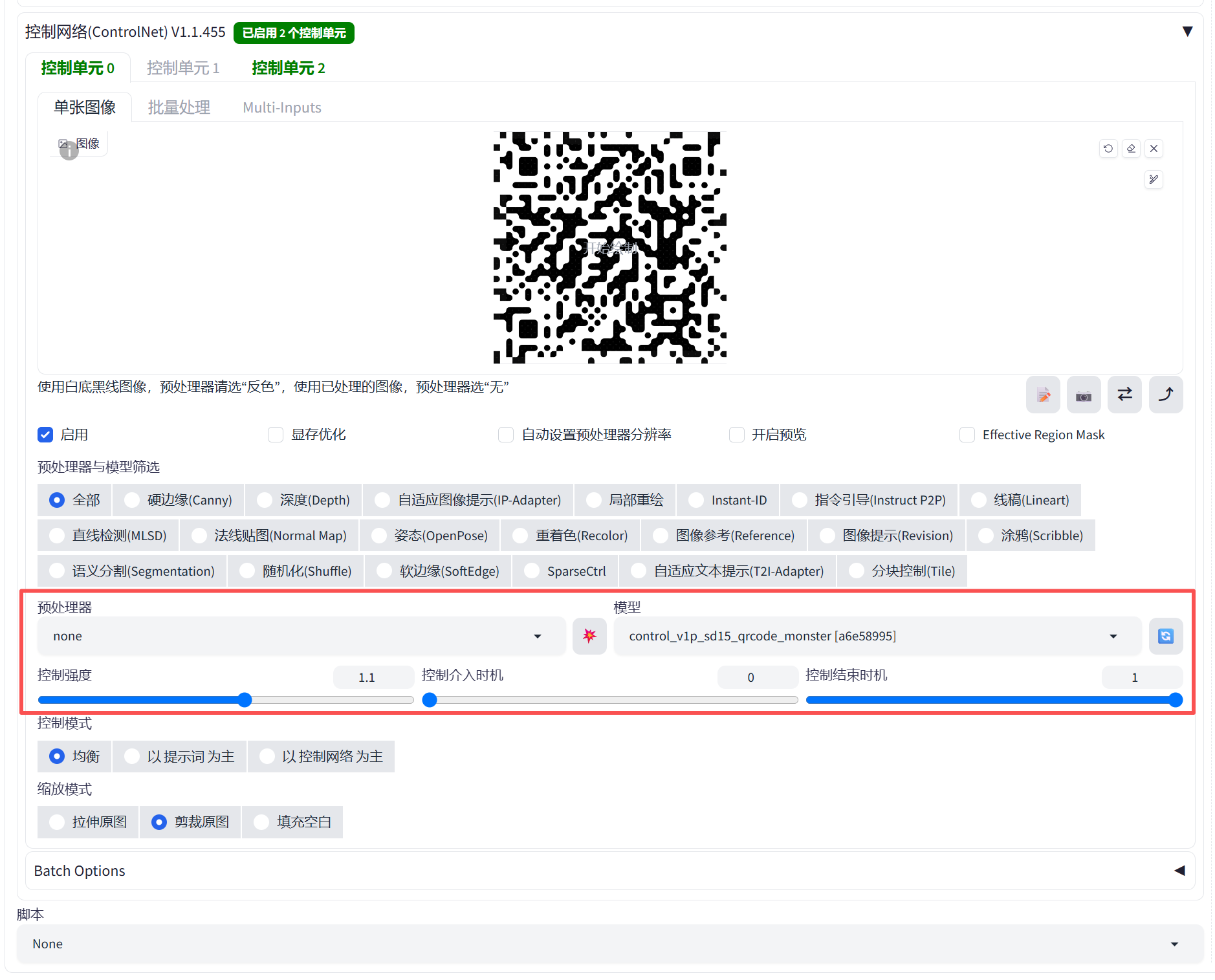 首先打开第一个 Controlnet 界面,将预处理好的二维码放进去,预处理去选择无,模型选择 control_vip_sd15_qrcode_monster (opens new window),这里的控制权在建议在 1.2~1.5,引导介入时机和引导终止时机默认。