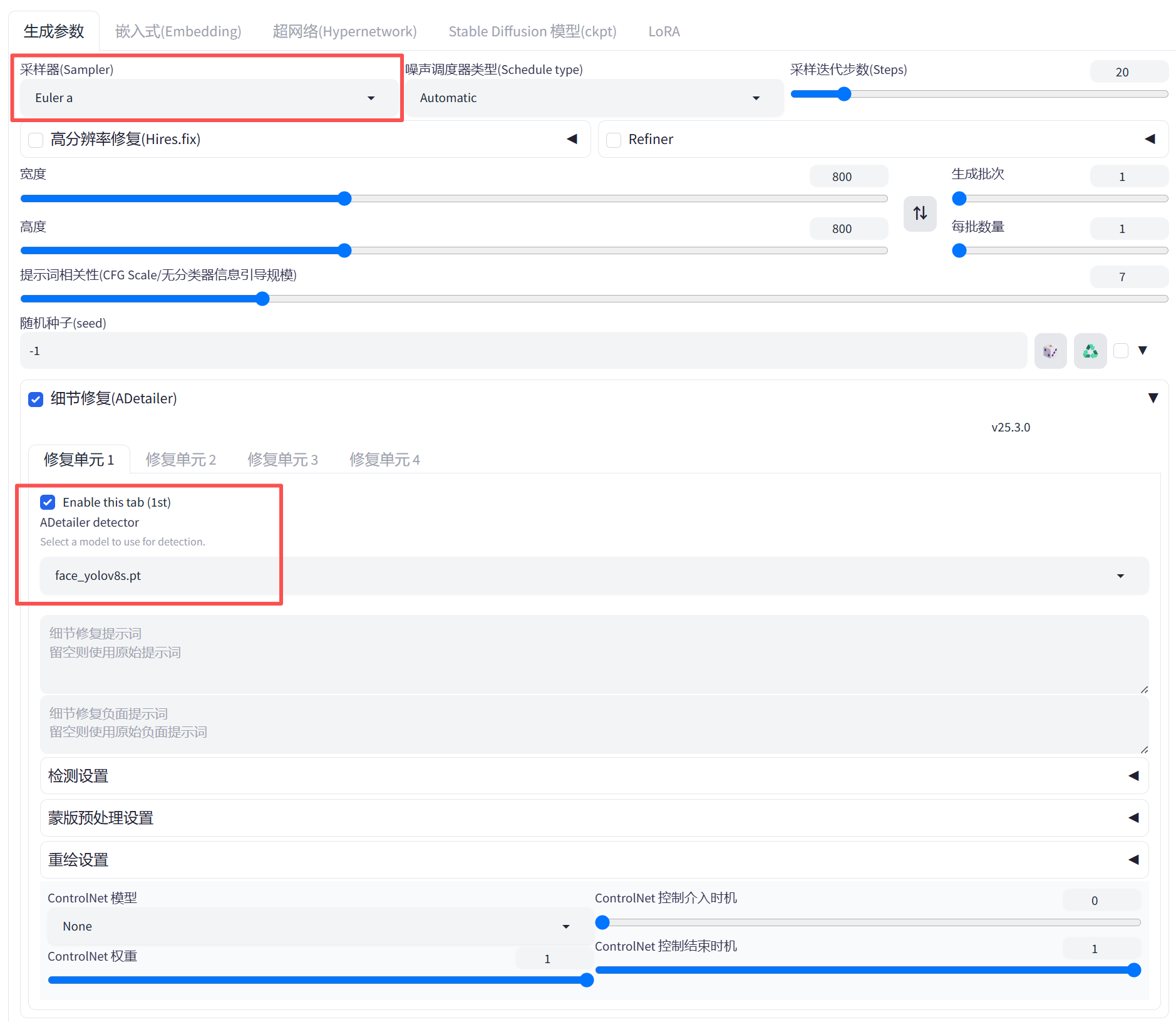 采样器可以使用 Euler a,其他的配置参数统一使用默认的就好。